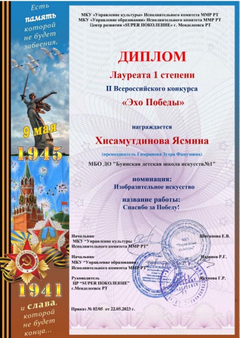 Объявлены результаты II Всероссийского конкурса "Эхо Победы", в котором Хисамутдинова Ясмина стала Лауреатом 1степени в номинации" Изобразительное искусство" (преподаватель Гимранова З.Ф.).