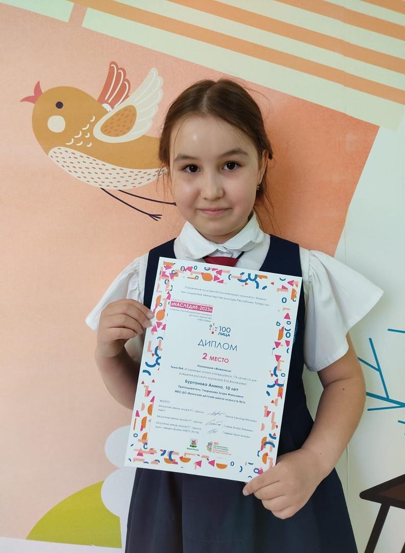 Ученица отделения изобразительного искусства Бурганова Амина 4(8)кл., преподаватель Гимранова З.Ф, получила диплом за 2 место в номинации "Живопись".Поздравляем юную художницу и желаем ей дальнейших творческих успехов!