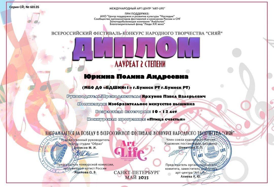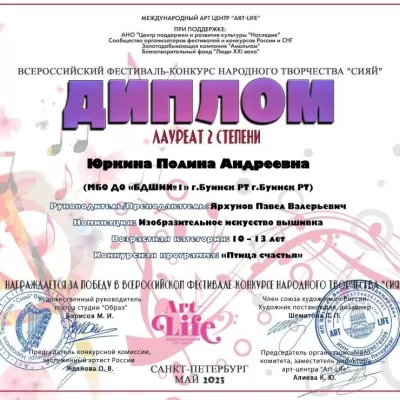По итогам конкурса выпускница отделения изобразительного искусства Юркина Полина 5(5) кл. стала лауреатом 2 степени, в номинации "ИЗО-вышивка".