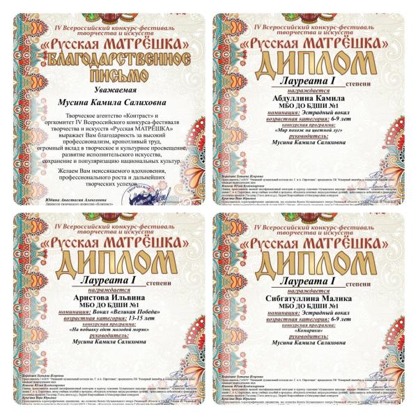 В марте месяце учащиеся вокального класса МБО ДО БДШИ приняли активное участие IV Всероссийском конкурсе-фестивале творчества и искусств «Русская МАТРЁШКА»(Руководитель Мусина К.С.).