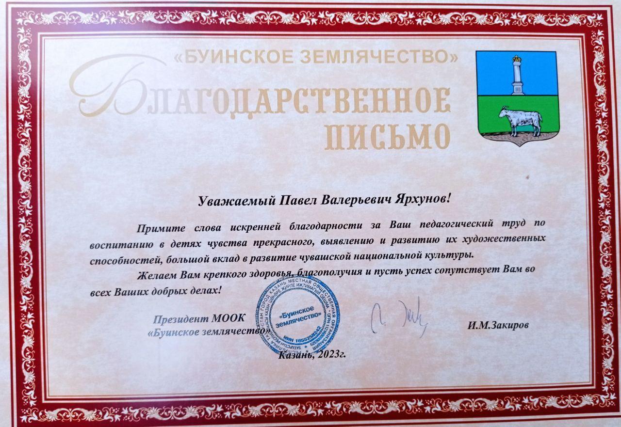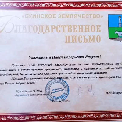Ему вручено благодарственное письмо Буинского землячества за вклад в развитие Чувашской культуры и сохранение народных традиций. Поздравляем желаем успехов!