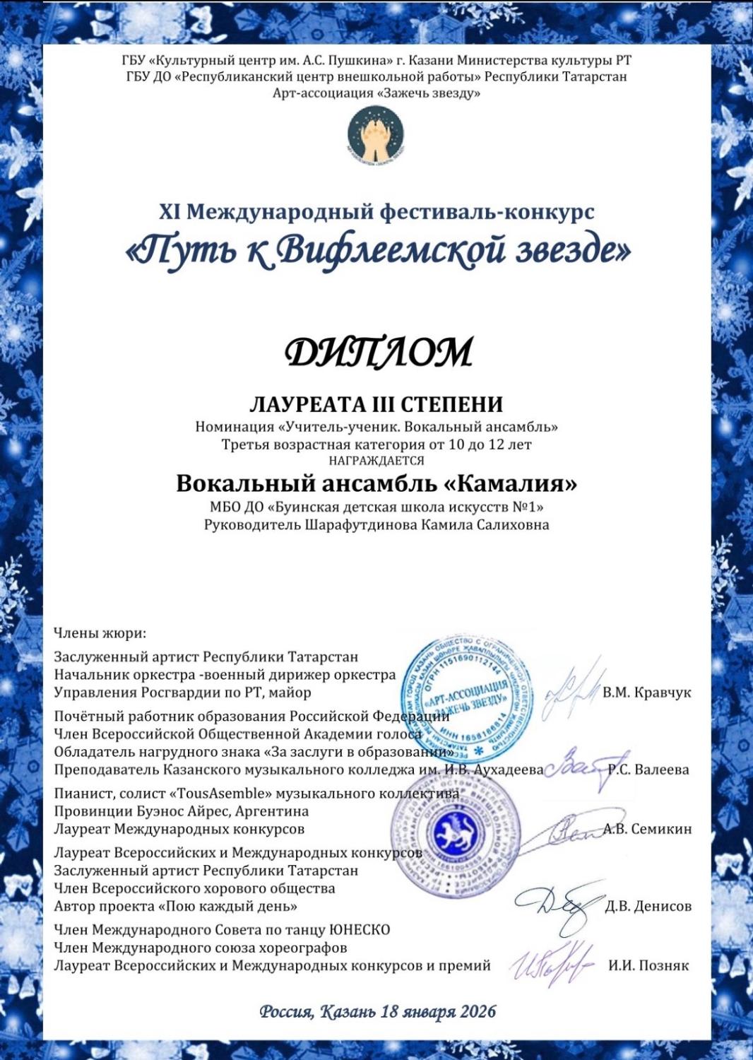 В данном конкурсе принял участие вокальный ансамбль «Камалия». Они удостоились звания Лауреата 3 степени.