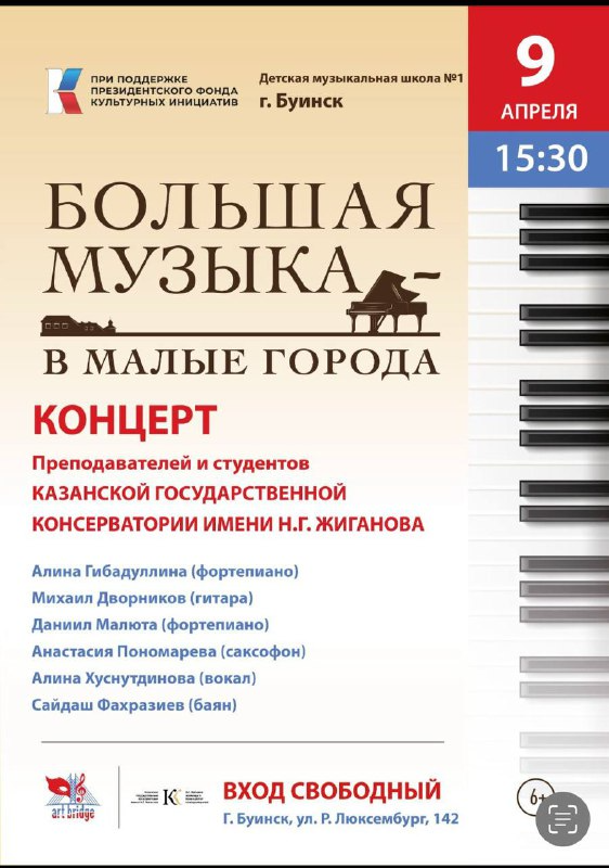 В рамках просветительского проекта "Большую музыку – в малые города" преподаватели и студенты Казанской консерватории выступят с концертом в Актовом зале МБО ДО БДШИ 1.