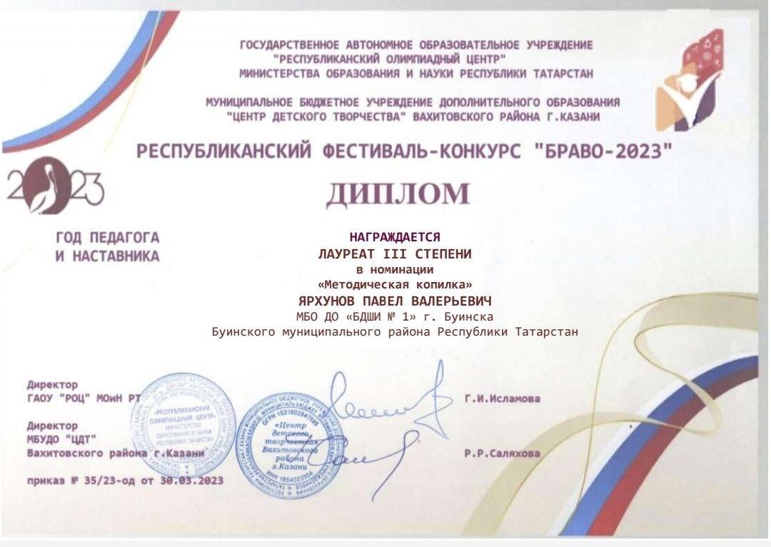 Подведены итоги республиканского конкурса-фестиваля "Браво-2023" г. Казань.В номинации "Методическая копилка" мастер- класс Ярхунова Павла Валерьевича по изготовлению свистульки занял III- место.Поздравляем и желаем дальнейших побед!