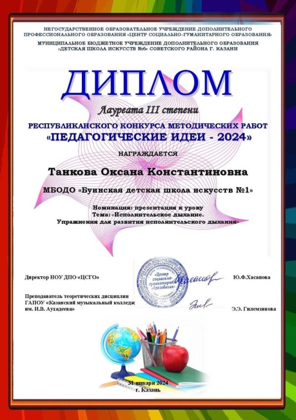 Преподаватель класса духовых инструментов Танкова Оксана Константиновна приняла участие в Республиканском конкурсе методических работ "Педагогические идеи -2024".