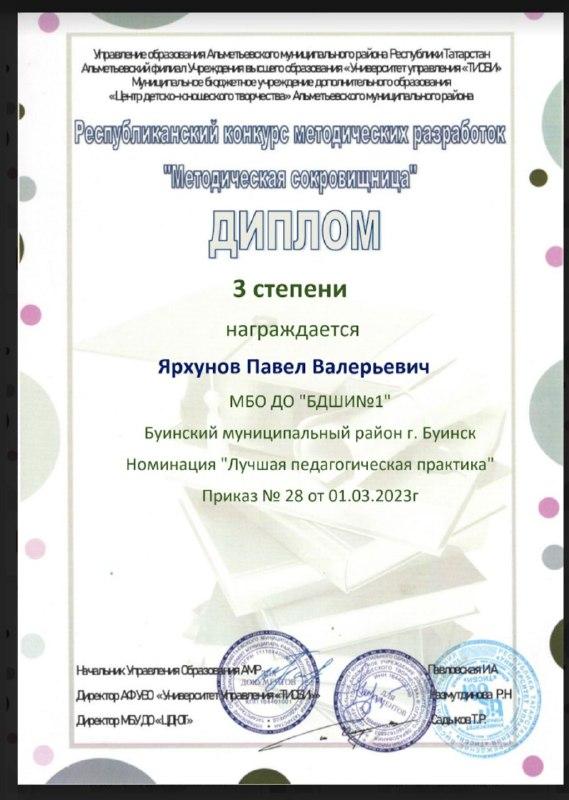 Преподаватель отделения изобразительного искусства Павел Ярхунов принял участие в Республиканском конкурсе методических разработок "Методическая сокровищница". По итогам конкурса, за мастер-класс по изготовлению кувшинчика преподаватель удостоен диплома 3-степени.
