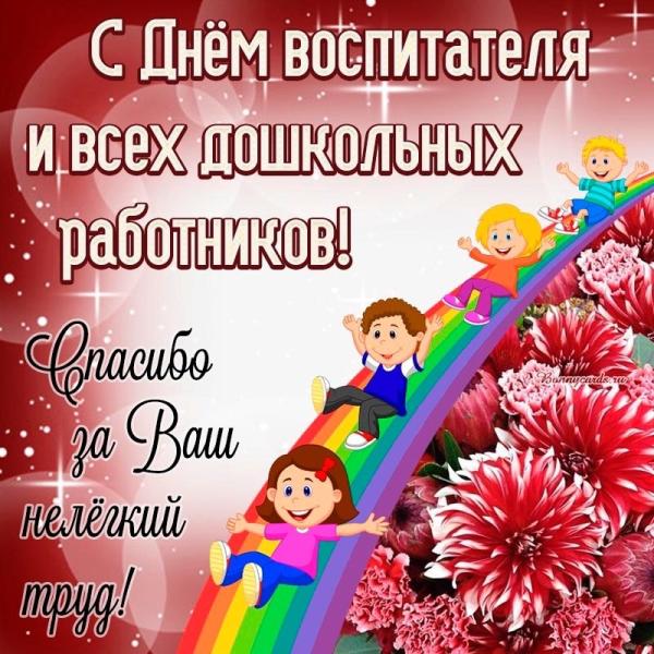Дорогие работники дошкольного образования, низкий вам поклон за ваш труд! Только поистине добрый и любящий человек может стать настоящим педагогом! Пусть работа приносит радость, пусть вас ценят и любят. Пусть то, что вы делаете, ценится по достоинству. Пусть в доме будет тепло и уютно, а в воздухе парят любовь, счастье и благополучие!