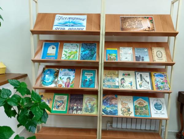 Русская поэзия представлена творчеством А.С. Пушкина, М. Ю. Лермонтова, А. А. Фета, Ф. И. Тютчева и других великих поэтов периода «Золотого века», творчеством поэтов «Серебряного века» , а также татарских поэтов М. Джалиля, Г. Тукая, детских писателей А. Барто, С. Михалкова, С. Я. Маршака. Учащиеся школы с большим интересом посетили выставку и прочитали представленные на ней стихи. Выставка организована библиотекарем Шакировой Фаридой Равилевной