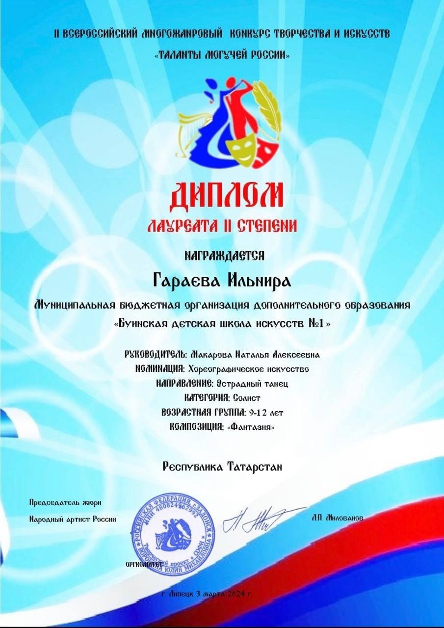В номинации «Хореографическое искусство» от нашей школы приняла участие Гараева Ильнира и удостоилась диплома лауреата 2 степени(Руководитель:Макарова Н.А.).